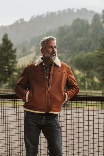 | Shearling Leather Bomber Jacket, Whiskey Brown | ||||||