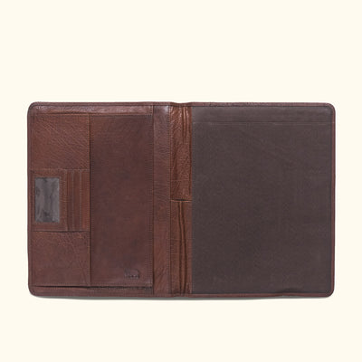 Inside, discover a treasure trove of features, from slots for credit cards to secure compartments for pens, documents, and a legal pad – a nod to the precision of Roosevelt's record-keeping. The legal pad, symbolizing eloquence and diligence, fits seamlessly into the folio, allowing you to capture your thoughts with the same gravitas as Roosevelt's eloquent prose. For the modern voyager, there's even a dedicated space for an iPad, bridging tradition and technology effortlessly. Whether you're navigating the urban jungle or exploring uncharted territories of the business world, let this vintage leather pad folio be your steadfast companion – a fusion of timeless sophistication and practicality, encapsulating the indomitable spirit of exploration. Embark on your journey, for it's one adventure you won't want to undertake without it.