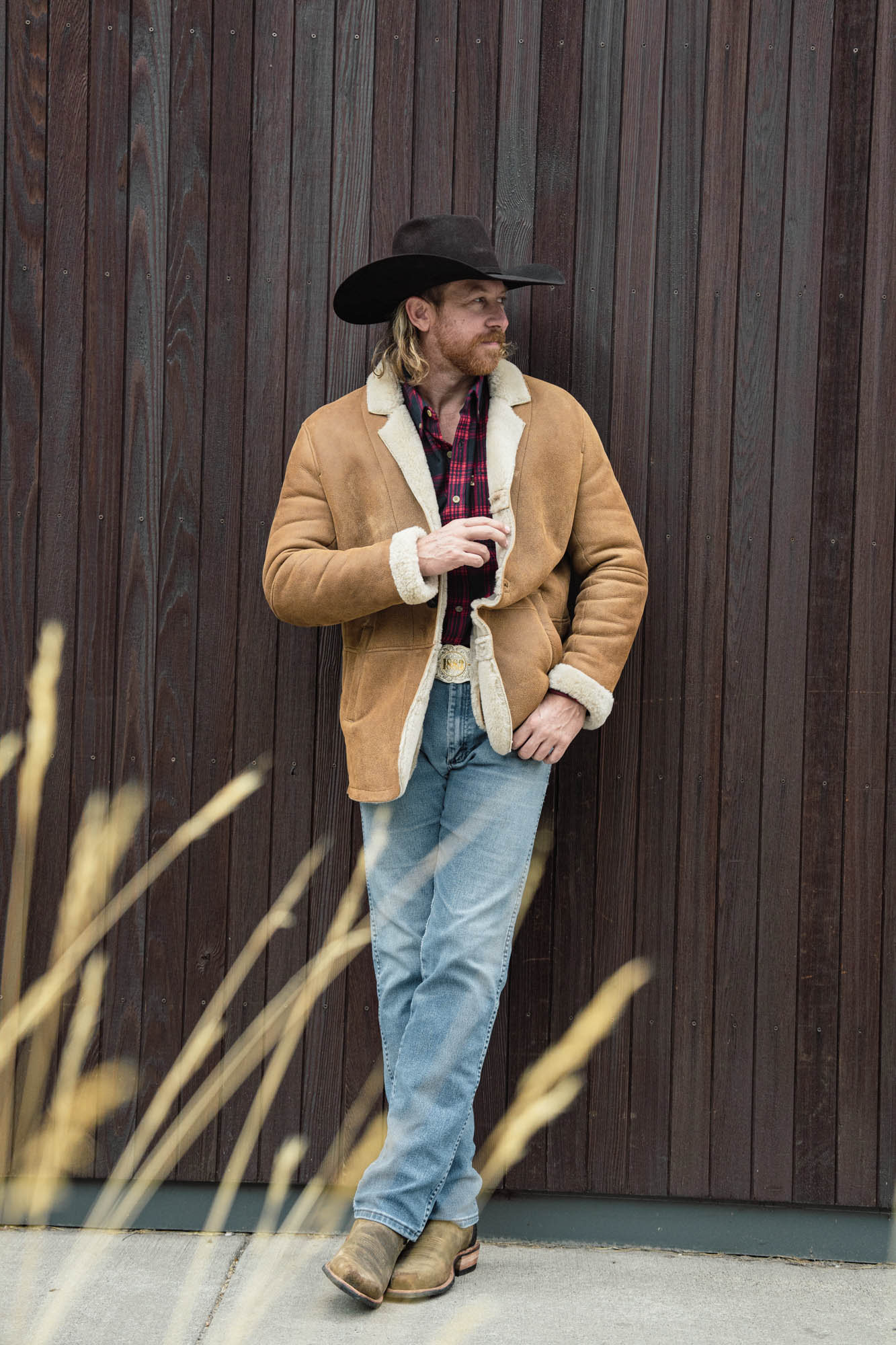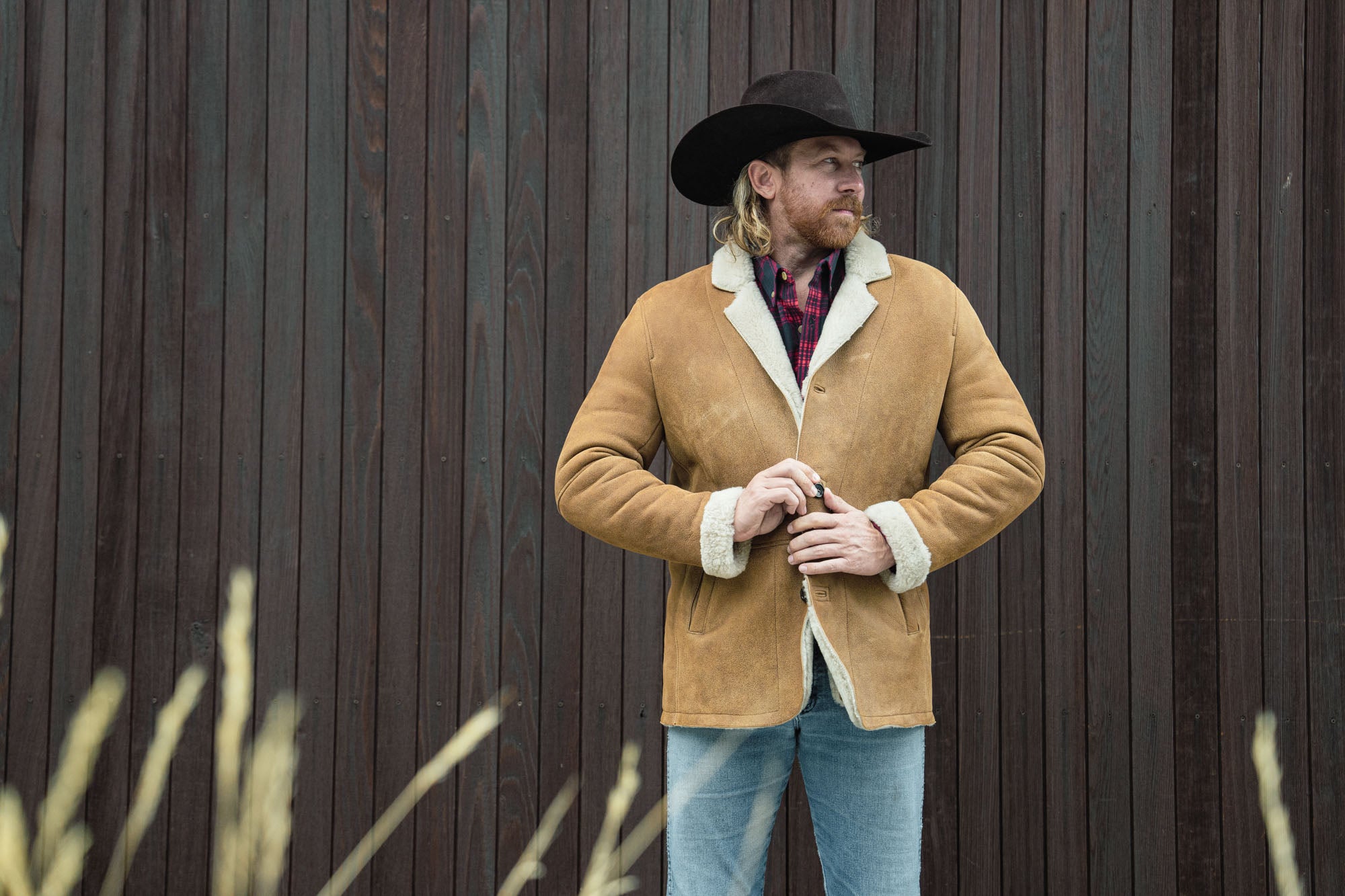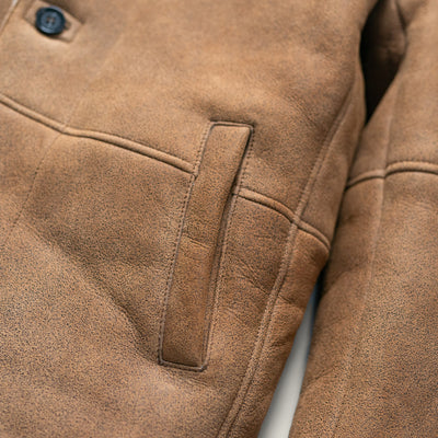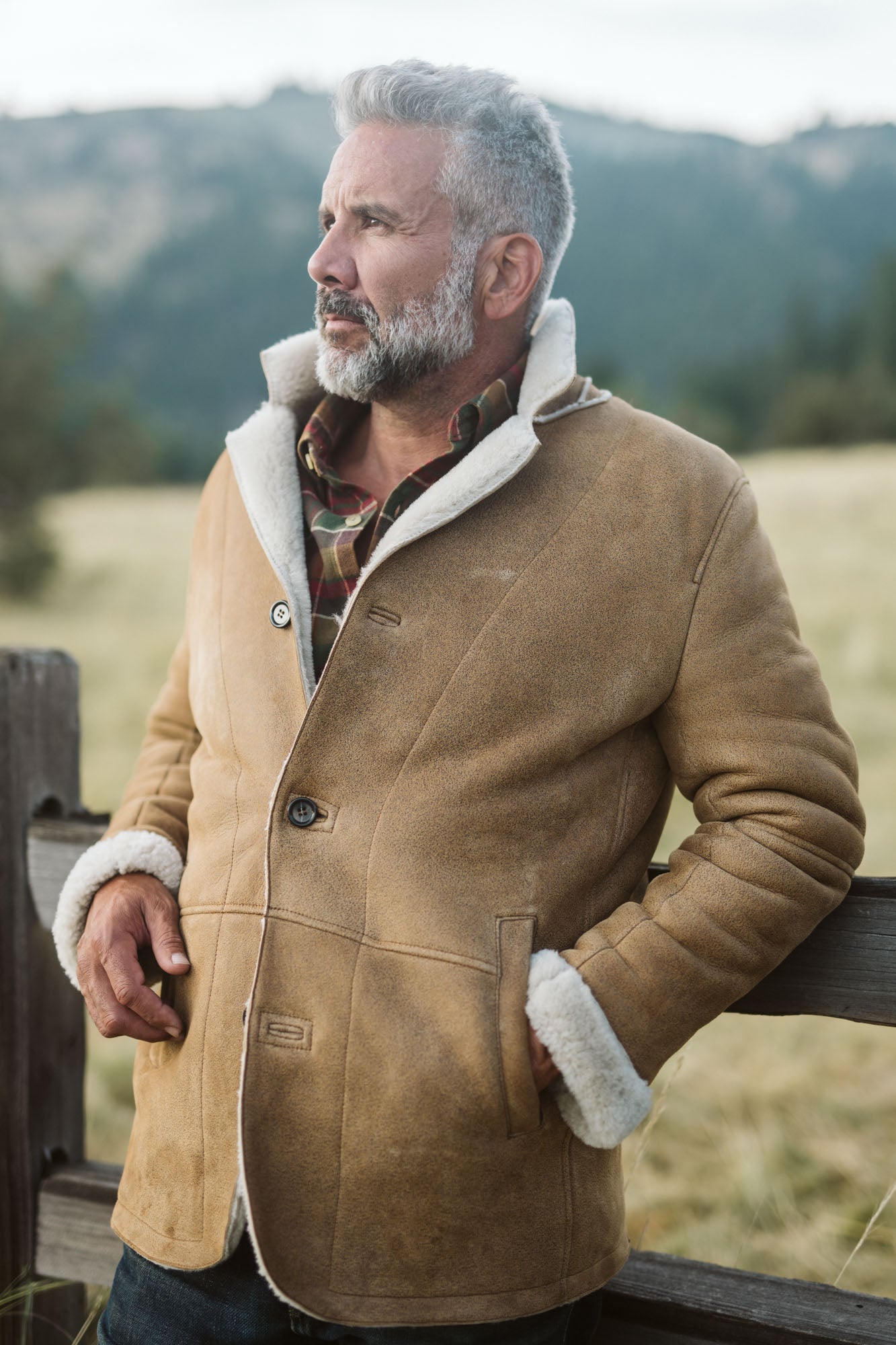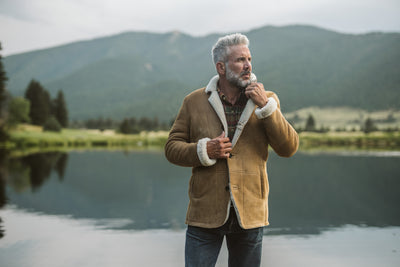 Out where the vast landscape meets the endless sky, a certain type of man stands taller—confident and resilient. For him, ruggedness and refinement coexist seamlessly, which is why the Big Sky Shearling Blazer is his perfect match.